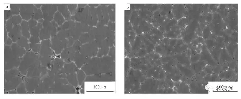 图1 未添加RE与添加w(RE)=0.3%的7075合金SEM形貌