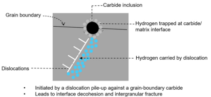 氢可以被困在间隙点阵位置、晶界、空位、合金溶质、层错、孪晶、位错及其位错胞壁、空隙、第二相及其界面、以及微裂纹的自由表面上。