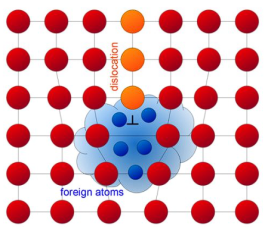 同时,很多研究者在低碳钢和BCC金属中观察到了氢致材料硬化的现象,说明氢原子也会阻碍位错运动。学者们认为溶质氢原子会在位错周围形成柯氏气团(通常把溶质原子与位错交互作用后,在位错周围偏聚的现象称为气团,是由柯垂尔首先提出。受柯氏气团钉扎的位错需要更大的应力使它们摆脱气团),阻碍位错运动。