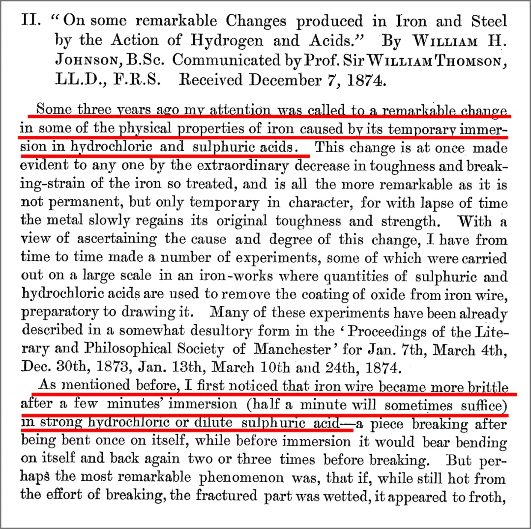 1870-1914年的第二次工业革命,是能源、交通和金属加工等行业协同发展的重要时期。在冶金领域,新方法和工艺的出现,实现了钢铁的大规模生产,钢铁材料广泛应用于建筑、交通等领域,从而彻底改变了20世纪的地理面貌。就在这样的时代背景下,当时在英国钢铁行业工作的冶金学家William H. Johnson,在研究中发现了一个困扰整个拉丝行业的谜团:为清除铁丝和碳钢丝储存中表面的锈迹,通常会将其浸入含酸水的浴槽中(即如今仍在使用的酸洗工艺),但清洗后铁丝和碳钢丝的韧性出现了降低,这种机械性能退化的原因在当时无法解释。针对这个问题,Johnson开展了较为系统的实验研究。1875年,Johnson在Proceedings of the Royal Society of London杂志上发表了一篇完整文章“On some remarkable changes produced in iron and steels by the action of hydrogen acids”,并在同年在Nature杂志刊登了“On some remarkable changes produced in iron and steel by the action of hydrogen and acids”,详细阐述了这一现象。