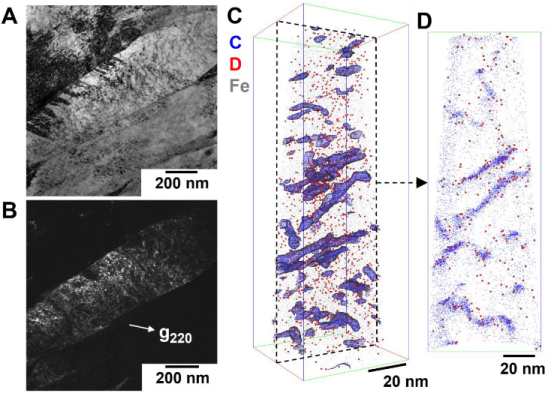 钢中的位错氢捕获现象:(A) 马氏体钢中位错的明场图像;(B) (A)的暗场图像;(C) 碳(蓝色)、作为氢标记的氘(红色)和铁(灰色)的三维原子探针断层扫描(APT)图,等浓度面(蓝色面)突出显示由聚集碳表示的位错位置;(D) (A)中标记区域的二维切片,显示碳(蓝色,即位错)和氘(红色)的重合位置
