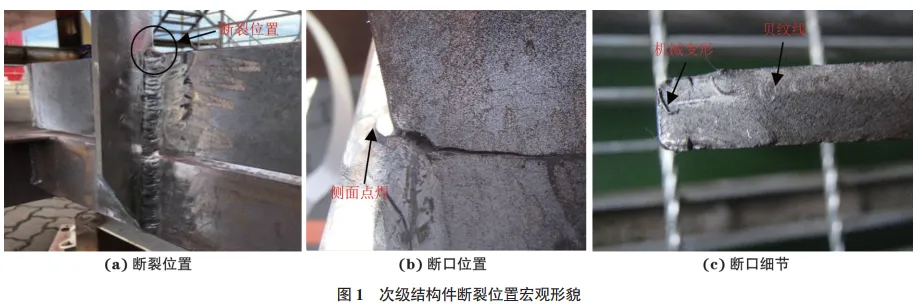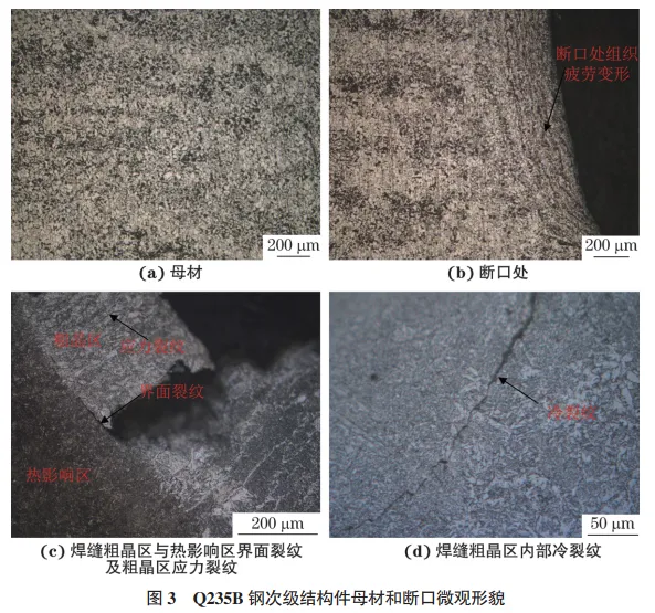 (1)次级结构件原材料的Mn 元素含量和抗拉强度高于国家标准GB/T 700—2006对Q235B钢的要求。 (2)次级结构件定位焊接时,焊缝长度短,冷却速率快,焊缝粗晶区存在冷裂纹及应力裂纹。 (3)次级结构件因受到机械撞击,发生机械变形,造成焊缝内部裂纹扩展。 (4)次级结构件在长途运输过程中受到周期性的疲劳应力,造成材料疲劳断裂。