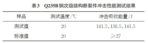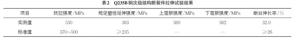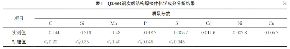 Q235B普通碳素结构钢中C元素含量适中,其强度、塑性、焊接性能较好,广泛用于制造海洋工程结构的次级结构件。次级结构件主要包括扶手、栏杆等,属于非承载部件,主要关注次级结构件的以下几个方面:材料质量、焊接质量、结构外观等。经核查,次级结构件原材料证书符合标准要求,结构外观符合图纸设计要求,经过磁粉检测,焊接部位外观质量符合标准要求。该次级结构件经过长途运输后,发现某焊接部位出现断裂现象。研究人员采用宏观观察、化学成分分析、力学性能测试、金相检验等方法分析了焊接件断裂的原因,以防止该类问题再次发生。