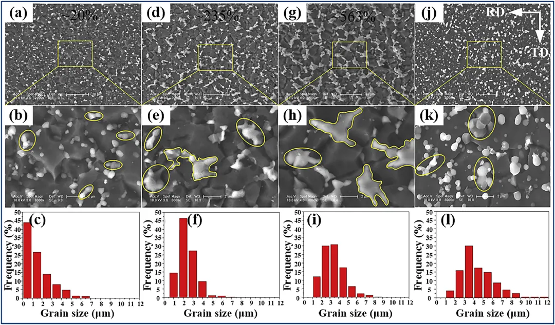 图2. AZ91合金在不同拉伸应变阶段的SEM图像:(a, b) ~20%应变;(d, e) ~235%应变;(g, h) ~563%应变(即断裂状态);(j, k) 在250℃等温热处理样品(对应~563%应变的等效保温时间)的微观结构。对应的晶粒尺寸分布图分别如(c, f, i, l)所示。