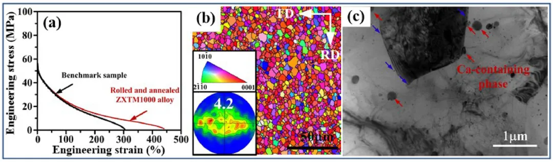 图9. (a) 基准样品和轧制退火态ZXTM1000合金在573 K和1×10⁻³ s⁻¹条件下拉伸的应力应变曲线;(b) 基准样品的IPF图;(c) 基准样品的TEM图像。