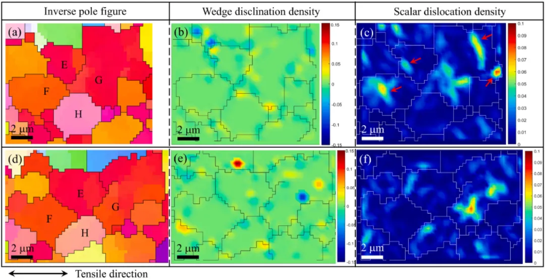 图13. (a) 拉伸至~100%应变的样品的IPF图像;(b) 对应的向错密度分量θ₃₃分布图(单位:rad μm⁻²);(c) 位错密度分布图(单位:μm⁻¹);(d) 拉伸至~120%应变样品的IPF图像;(e) 对应的向错密度分量θ₃₃分布图;(f) 位错密度分布图。