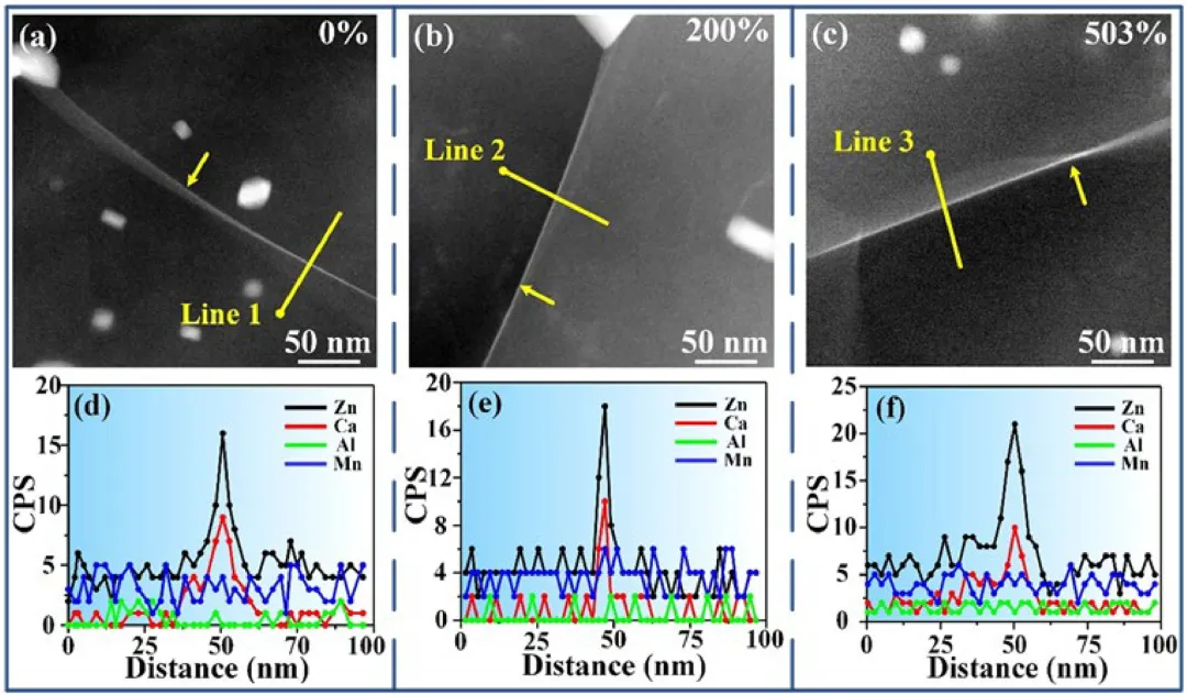 图11. (a–c) 拉伸至不同应变(0%、~200%、~503%)样品的HAADFSTEM图像;(d–f) 跨越晶界的EDS线扫描分析。