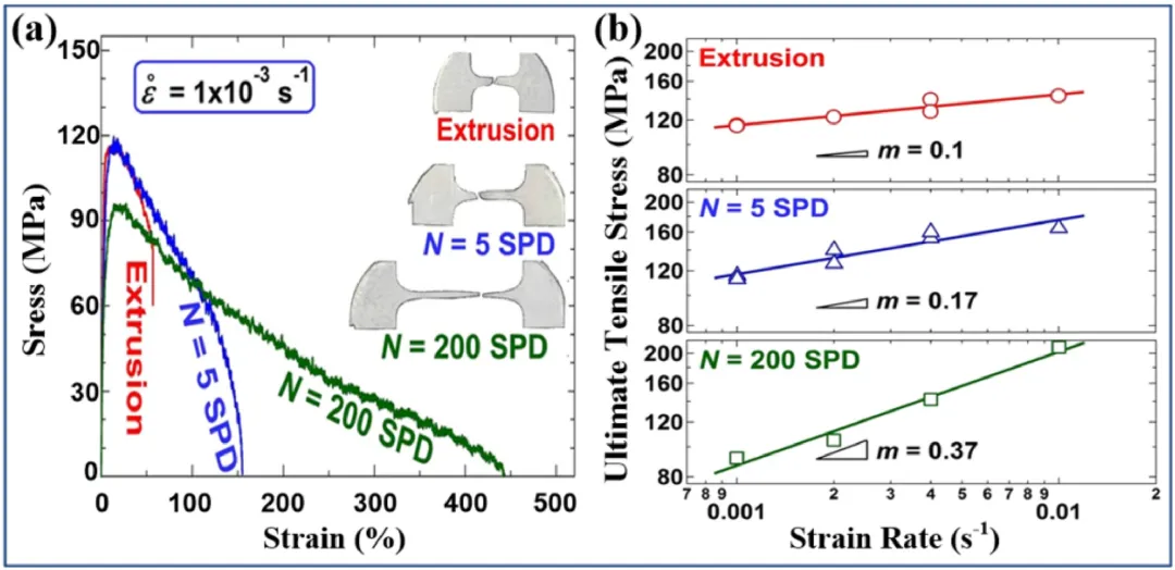 图17. 挤压态和HPT工艺制备的Mg-8Li合金在300 K下的拉伸测试结果:(a) 应变速率为1×10⁻³ s⁻¹时的应力应变曲线;(b) 极限拉伸应力随应变速率的变化;斜率代表应变率敏感性m。