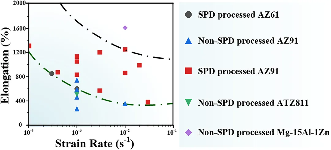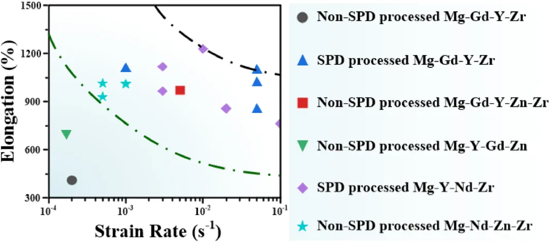 图7. 典型超塑性Mg-RE系合金的力学性能统计。虚线显示了应变率与超塑性之间的权衡关系。