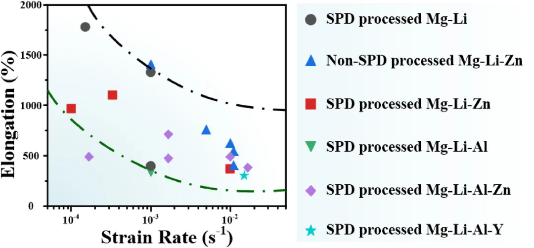 图8. 典型超塑性Mg-Li系合金的力学性能统计。虚线显示了应变率与超塑性之间的权衡关系。
