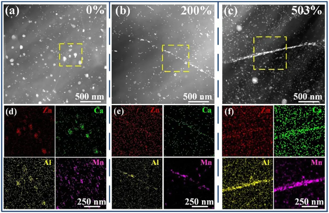 图10. ZXAM2111合金在623 K和1.0×10⁻³ s⁻¹条件下拉伸至不同应变(0%、~200%、~503%)时的HAADFSTEM图像:(a–c) 及其对应的黄色矩形区域的EDS分析结果 (d–f)。
