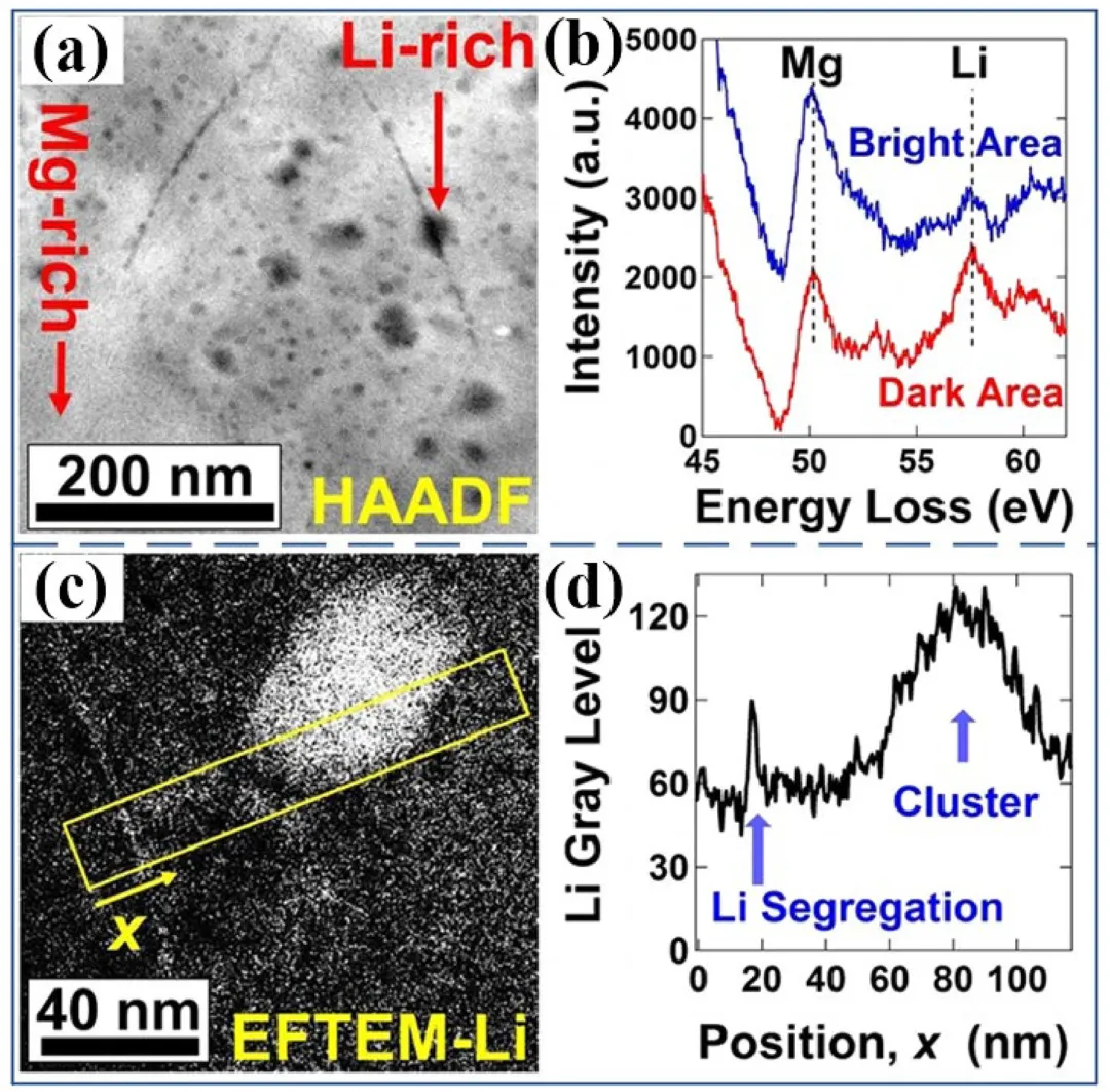 图16. HPT工艺制备的Mg-8Li合金的微观组织:(a) HAADF图像显示Mg和Li原子的分布,表明Li沿晶界偏聚;(b) 对应的EELS图谱;(c) Li元素的能量过滤透射电子显微镜(EFTEM)图;(d) EFTEM图像中沿x方向的Li灰度变化。