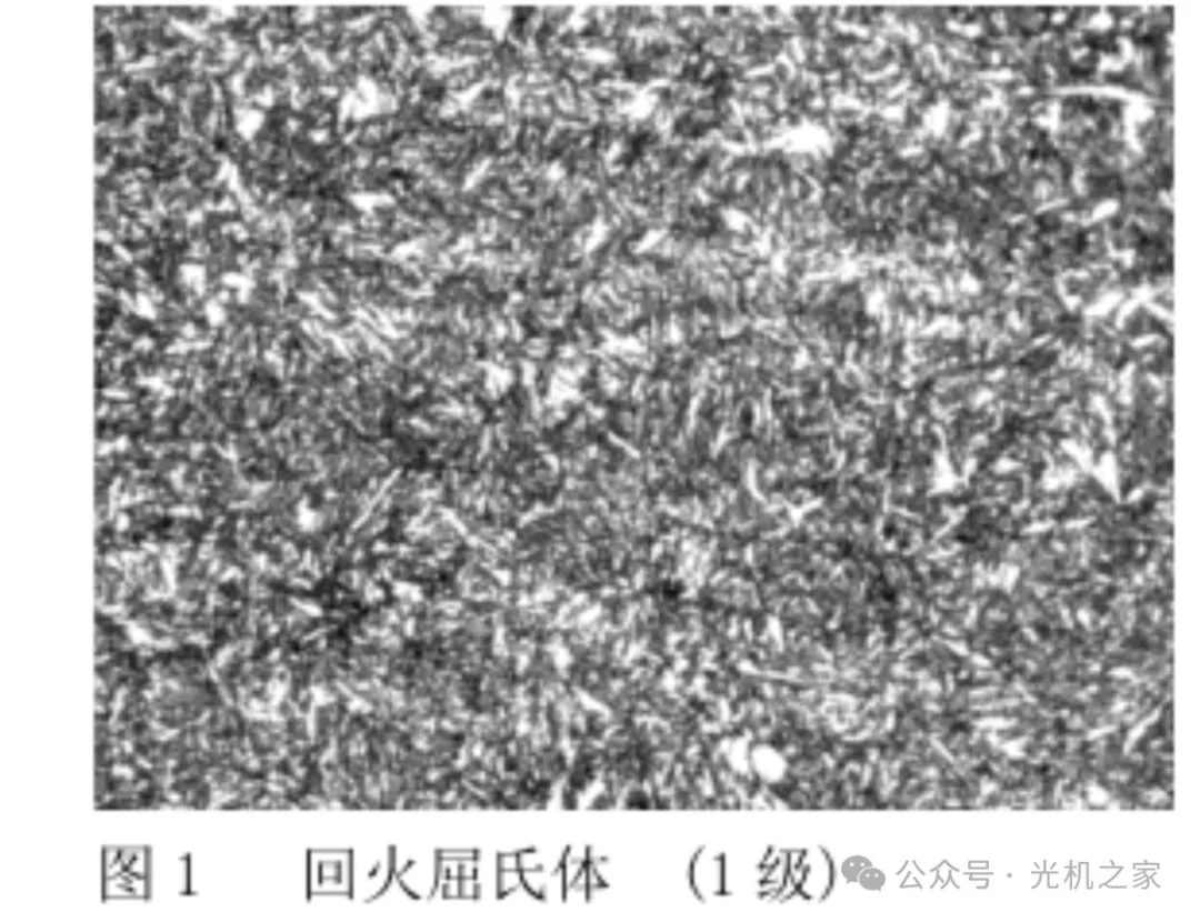 特征:回火屈氏体由马氏体在350~500℃时中温回火形成。其组织特征是铁素体基体内分布着极细小的粒状碳化物,针状形态已逐渐消失,但仍隐约可见。碳化物在光学显微镜下不能分辨,仅观察到暗黑的组织,在电镜下才能清晰分辨两相。