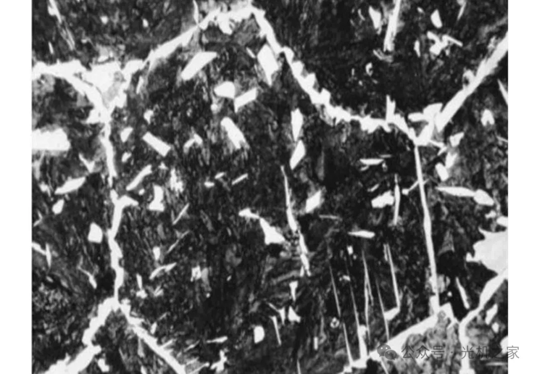 特征:魏氏组织在亚共析钢中表现为铁素体的形态有片状、羽毛状或三角形,粗大铁素体呈平行或三角形分布;在过共析钢中表现为渗碳体的形态有针状或杆状。魏氏组织出现在奥氏体晶界,同时向晶内生长,对钢的机械性能有不利影响。