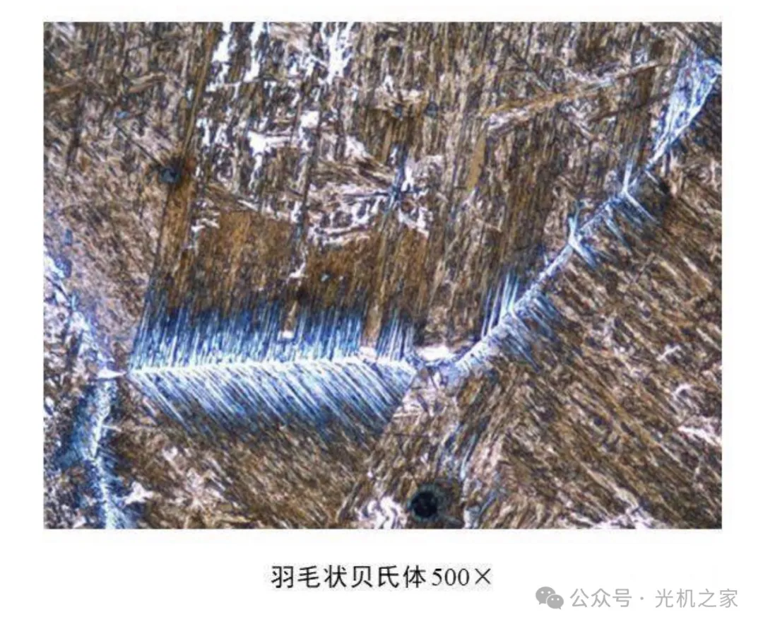 特征:上贝氏体是过冷奥氏体在中温(约350~550℃)的相变产物。其典型形态是一束大致平行排列的针状铁素体板条,并在各板条间分布着沿板条长轴方向排列的碳化物短棒或小片。上贝氏体呈羽毛状,晶界为对称轴,羽毛可对称或不对称。