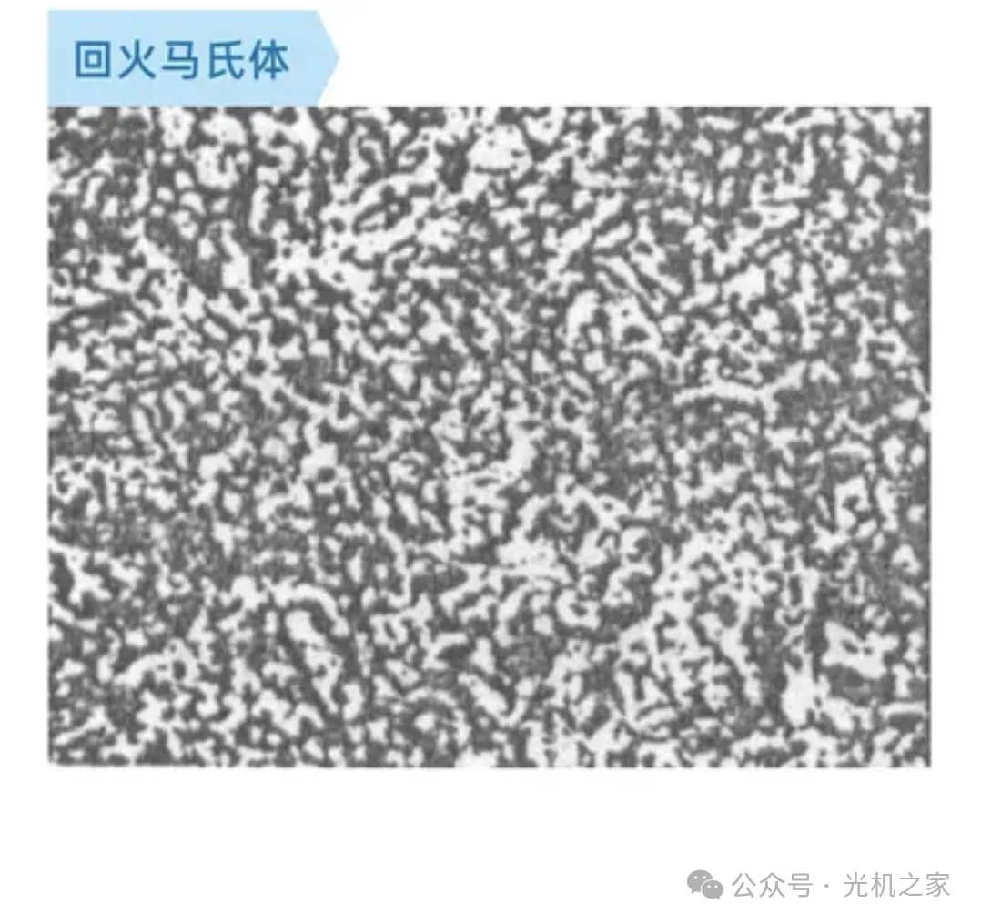 特征:回火马氏体由马氏体在150~250℃时回火形成。这种组织极易受腐蚀,光学显微镜下呈暗黑色针状组织(保持淬火马氏体位向),与下贝氏体很相似,只有在高倍电子显微镜下才能看到极细小的碳化物质点。