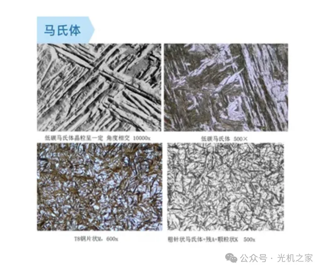 特征:马氏体是钢在淬火过程中形成的一种不平衡组织,具有高强度和高硬度。根据形成温度的不同,马氏体可以分为板条马氏体和针状(片状)马氏体。板条马氏体在低、中碳钢及不锈钢中形成,由许多相互平行的板条组成一个板条束;针状马氏体常见于高、中碳钢及高Ni的Fe-Ni合金中,针叶中有一条缝线将马氏体分为两半。