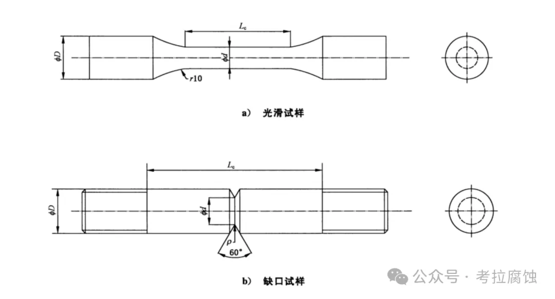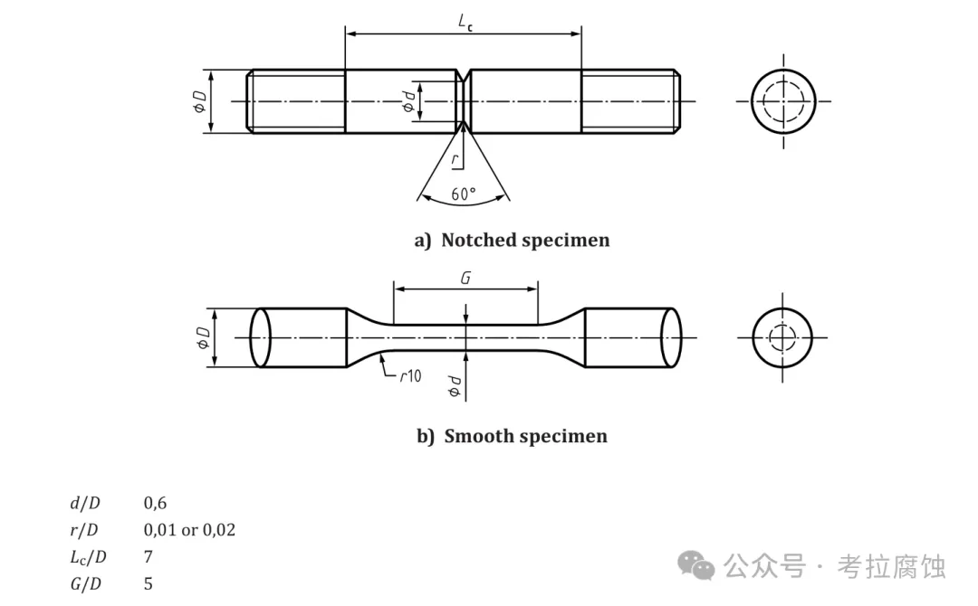 【1】ISO 16573:2015 Steel- Measurement method for the evaluation of hydrogen embirttlement resistance of high strenth steelsISO 16573:2015中推荐的试样尺寸,下图。直径D=10mm的试样为标准试样。根据实际情况,小尺寸试样(如,D=5mm),r/D=0.02等试样也可选用。【2】GB/T 39039-2020 高强钢氢致延迟断裂评价方法(Evaluation method for hydogen-induced fracture of high strength steels)取样部位按照GB/T 2975,推荐采用光滑试样、缺口试样、板状试样。试样几何尺寸如代表。建议采用直径10mm圆棒或厚度2mm的板状试样。【3】ASTM G142 Standard test methof for determination of susceptibility of metals to embrittlement in hydrogen containing environments at High pressure, High temperature, or Both中给出的标准光滑试样和标准缺口试样。【4】GB/T 34542.2 氢气储存输送系统 第2部分:金属材料与氢环境相容性试验方法,中给出的标准带缺口圆棒试样。