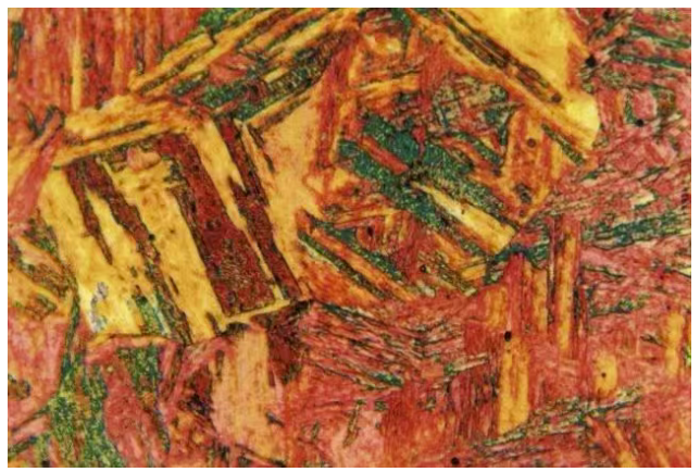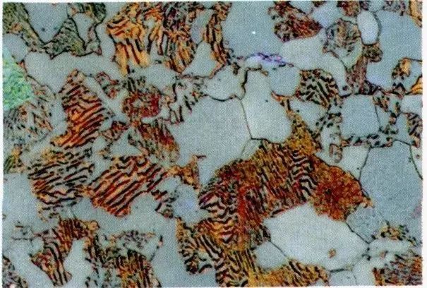 铁素体魏氏组织:在亚共析钢中,当奥氏体以快冷速度通过Ar3~Ar1温度区时,铁素体片插向奥氏体晶粒内部,这些分布在原奥氏体晶粒内部呈片状先共析铁素体被称为铁素体魏氏组织;