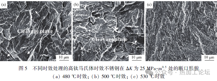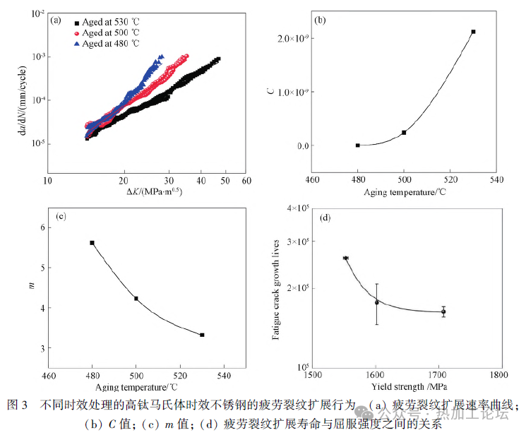 1 试验材料及方法 选择高钛马氏体时效不锈钢为研究对象,其化学成分如表1所示。首先利用电火花线切割技术从大圆棒上切取小块,然后对小块进行固溶处理,处理温度为1050℃,时间为1h,冷却方法为空冷。在固溶处理之后,对小块进行时效处理,时效温度分别为480、500和530℃,相应的时效时间分别为60、8和4h,冷却方式为空冷。根据时效温度的不同,将经上述制度热处理后的样品分别命名为480℃ 时效、500℃时效和530℃时效。上述不同热处理状态高钛马氏体时效不锈钢的拉伸性能如表2所示。对不同时效处理试样进行研磨,然后进行凹坑及离子减薄以制备透射电镜样品,最后利用Talos F200X场发射透射电镜(TEM)对微观组织进行表征。 裂纹扩展实验在Instron 8801型液压试验机上进行,试样为单边缺口三点弯曲试样,尺寸如图1所示,试样的尺寸依照GB/T 6398—2017《金属材料疲劳试验疲劳裂纹扩展方法》来进行设计。采用逐级降力法来预制疲劳裂纹,初始实验力选取6~7kN,正弦波加载,实验频率为10Hz,应力比为0.1,相邻级别载荷下降率不高于20%。在预制完疲劳裂纹之后,选择最后一级预制裂纹的载荷进行疲劳裂纹扩展实验,到试样断裂。在完成疲劳裂纹扩展速率测试后,采用电火花线切割技术切取断口表征试样,然后对试样进行超声清洗,最后在JSM-6510或Sigma 500场发射扫描电镜(SEM)下对疲劳裂纹扩展形貌进行观察。 2 试验结果与讨论 2.1 微观组织 图2给出了不同时效处理样品的显微组织。从图2中可以看出,480℃时效样品的基体中存在密集分布的颗粒状析出相和棒状析出相(图2a),而根据前人的研究可以判定析出相为Ni3Ti。500℃时效样品的析出相形貌如图2(b)所示,其基体内同样存在着大量且密集分布的析出相。从图2(c)可以看出,530℃时效样品内部棒状析出相的数量开始逐渐增多,颗粒状析出相开始逐渐减少,析出相的分布也开始变得稀疏。480℃时效、500℃时效和530℃时效样品内棒状析出相的平均长度分别约为11.5、7.9和15.9nm,平均宽度分别约为2.8、2.8和4.3nm(见表3)。综上,对比不同温度时效处理样品的微观组织可以发现,随着时效温度的升高,析出相的尺寸逐渐增大,分布逐渐变得稀疏。 2.2 疲劳裂纹扩展行为 疲劳裂纹扩展速率曲线可分为3个区域:近门槛区、稳态扩展区和高速扩展区。不同时效处理高钛马氏体时效不锈钢的疲劳裂纹稳态扩展区如图3(a)所示。从图3(a)可以看出,530℃ 时效样品的裂纹扩展速率要低于500℃时效和480℃时效样品,500℃时效和480℃时效样品的疲劳裂纹扩展速率曲线相互交叉,在ΔK较大时,500℃时效样品的疲劳裂纹扩展速率要低于480℃时效样品。 1961年,Paris根据大量实验数据提出了稳态扩展区da/dN与ΔK之间的经验公式,即Paris公式: 式中:C和m均为描述疲劳裂纹扩展性能的材料常数,分别被称为Paris 系数和指数。Paris公式可以很好地描述材料疲劳裂纹稳态扩展阶段的一般规律,通过积分能够计算出疲劳裂纹扩展寿命。图3(b)和3(c)分别给出了时效温度对C和m的影响规律,从图中可以看出随时效温度升高C值逐渐增大,m值则逐渐减小。根据Paris公式,530℃时效、500℃时效和480℃时效样品的疲劳裂纹扩展速率曲线可分别表示为: 不同时效处理的高钛马氏体时效不锈钢的疲劳裂纹扩展寿命( ΔK由14MPa·m0.5增大至25MPa·m0.5)与屈服强度之间的关系如图3(d) 所示。从图3(d)可以看出,疲劳裂纹扩展寿命呈现出随屈服强度增加而降低的趋势。 图4给出了不同时效处理的高钛马氏体时效不锈钢在ΔK为15MPa·m0.5 处的断口形貌。对480℃时效样品而言,其断口表面主要包括了河流花样和解理面(图4a);以上说明,对480℃时效样品来说,其疲劳裂纹扩展主要有两种机理:钝化-复锐和微区解理。500℃时效样品在ΔK为15MPa·m0.5 处的疲劳裂纹扩展断口形貌如图4(b)所示,从图中可以看出其断口表面同样主要由河流花样和解理面组成,只是单个解理面的尺寸会相对较小。而对530℃时效样品来说,其断口表面则全部由河流花样组成,并没有发现解理面(图4c)。当材料的疲劳裂纹以微区解理的方式扩展时,其疲劳裂纹扩展速率会大幅提高。因此,具有相对较大解理面的480℃时效样品在ΔK为15MPa·m0.5时的疲劳裂纹扩展速率会相对较快。 图5给出了不同时效处理的高钛马氏体时效不锈钢在ΔK为25MPa·m0.5 处的断口形貌。从图4(a)和5(a) 可以看出,随着裂纹扩展(ΔK的增大),480℃时效样品断口表面的河流花样逐渐消失,解理面尺寸逐渐增大。而对500℃时效样品而言,其断口表面还是由河流花样和解理面组成(图5b),而解理面的尺寸同样是随ΔK的增大而增大(图4b和5b)。530℃时效样品的疲劳裂纹扩展形貌如图5(c)所示,可以看出,ΔK从15MPa·m0.5增大到25 MPa·m0.5后,530℃时效样品的断口形貌并没有发生变化,还是由河流花样组成,且没有发现解理面。 2.3 疲劳裂纹扩展机制 疲劳裂纹在扩展时,裂纹尖端存在着一个塑性区,在外加应力强度因子范围为ΔK时,裂纹尖端的循环加载塑性区尺寸rc可以用式(5)进行计算: 式中:σy为屈服强度。从式(5)可以看出,材料屈服强度相对较低时,其裂纹尖端的循环加载塑性区尺寸会相对较大。塑性区尺寸越大越容易缓解裂纹尖端的应力集中,进而在一定程度上延缓裂纹扩展;此外,塑性区尺寸越大也越容易发生塑性诱发裂纹闭合效应,进而也能在一定程度上抑制疲劳裂纹扩展。 由此可以判断,较高温度时效处理高钛马氏
