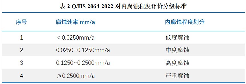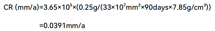 在石油天然气领域,金属管道的腐蚀如同“无声的威胁”,时刻侵蚀设备安全与生产稳定。如何精准监测这种“慢性病”呢? 《对挂片分析标准NACE SP0775-2023版修订内容的解读》,全面解读了腐蚀挂片的使用和操作规范。这些不起眼的金属试片,是如何成为守护管道健康的“沉默哨兵”呢? 本 质:材质、表面处理状态与目标管道设备一致的金属试片。 使 命:被委以重任于金属管道易腐蚀部位(如低流速区、气液界面、固液沉积区),与管道内表面完全暴露在相同腐蚀环境(油、气、水等)。 原 理:作为管道的“替身”,挂片经历与实际管道物流相同的腐蚀环境。定期取出后,通过精密测量其腐蚀失重、表面形貌,推断在相同条件下金属管道内壁的腐蚀状况。 平均腐蚀速率计算是挂片分析的核心步骤。NACE SP0775-2023依据基本原理,给出以下关键公式: CR=K×(W/(A×T×D) ) 公式参数深度解读: CR:腐蚀速率。核心目标值,直观反映金属被腐蚀消耗的快慢程度。 常用单位:毫米/年(mm/a)、密耳/年(mpy)。 W:挂片腐蚀失重。单位:克(g)。通过挂片暴露前精确称重(Initial Weight)和取出清洗后精确称重(Final Weight)相减得到。 A:挂片暴露在介质中的总表面积。需精确测量计算。挂片通常有多个面,直接接触腐蚀介质的面才计入A,以常见的CI COSASCO各类型腐蚀挂片为例,其不同尺寸的表面积见表1。 常用单位:平方毫米(mm²)、平方厘米(cm²)、平方英寸(in²) T:挂片暴露在腐蚀环境中的总时间。单位:天(days)。精确记录挂片安装和取出的日期时间。 D:挂片金属材料的密度。单位:克/立方厘米(g/cm³)。常见金属密度如碳钢X65约7.85 g/cm³、不锈钢316L约8.00g/cm³。 K:单位转换常数。它的值取决于你最终想要的腐蚀速率单位(CR)。 当A取公制单位(mm2)时,CR单位为mm/a:K=3.65×10⁵, 当A取英制单位(in2)时,CR单位为 mpy:K=2.227×104 重要提示:必须根据选定的CR单位选择正确的K值!这是公式应用中最常出现错误点之一。 应用示例 某混输管道中碳钢挂片(D=7.85g/cm³),暴露表面积A=33cm²,暴露时间T=90d,测得失重W=0.2500g。计算平均腐蚀速率(mm/a)过程为: 计算后平均腐蚀速率为约0.0391 mm/a,例如参照Q/HS 2064-2022《海上油气田生产工艺系统内腐蚀控制及效果评价要求定义》内腐蚀程度分级标准,确定为中度腐蚀,详情如表2。 确定腐蚀挂片最深坑的深度,并除以暴露时间。以下公式可根据所需的单位确定最大点蚀率: 应用示例 经过深度测量校准的光学显微镜聚焦在凹坑的未腐蚀金属上,后聚焦在凹坑的底部测量坑深度,如图1所示:某混输管道中腐蚀挂片最深坑深度为66.5μm,暴露时间T=90d。 图1 最深坑深度测量结果 计算最大点蚀率(mm/a)过程为: 腐蚀挂片分析时应结合Q/HS 2064-2022标准第6.1条,腐蚀特征确定内腐蚀控制程度,平均腐蚀速率不应高于 0.076mm/a,点蚀速率不应高于0.210mm/a,挂片表面不应出现肉眼可见的局部腐蚀。 常用各类型腐蚀挂片平均腐蚀速率和最大点蚀速率计算表模板.xlsx。如您需要,可下载直接后利用。 腐蚀挂片宛如一位兢兢业业的“沉默哨兵”,以简洁、高效且可靠的运行模式,持续为油气田工业设施贡献着关键的腐蚀情报。更为精准、快速、全面计算腐蚀速率,是对它传递信息的破译之举,也是理解腐蚀发展态势的关键一步。