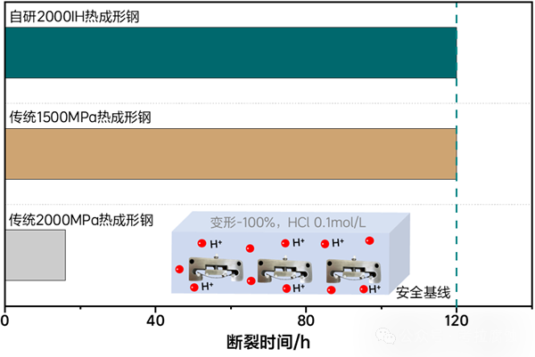 采用的四点弯曲测试验证,在pH=1的酸性环境下,泡酸120小时的加速试验中,2000IH展现出与传统1500MPa热成形钢相当的抗氢脆性能,其抗氢脆能力更是超过传统2000MPa热成形钢的5倍以上。