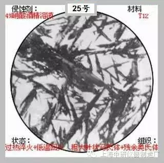 25、T12-1100水淬低温回火低温回火组织M+Ar,粗针状黑色回火M体及灰白色的残留Ar。
