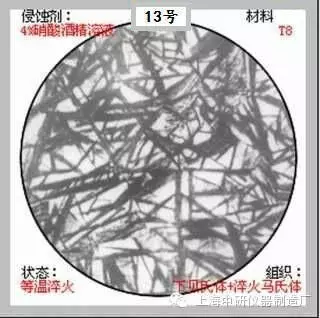 13、T8钢-等温淬火-B下+M+A残。B下是呈扁片状的过饱和F与分布在F内的短针状Fe3C的两相混合物。