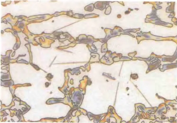本文精选了一组不同钢铁的微观组织图,每一张图都附有拍摄设备与解读要点,既是材料科学的视觉档案,也是工程师的实用参考。无需复杂术语,只需一双好奇的眼睛——让我们从微观图像中,读懂钢铁的“基因密码”。 研究对象:X80管线钢 拍摄设备:Quanta 400 SEM 技术背景:对管线钢的研究表明,钢中重要的组织单元是有效晶粒,有效晶粒尺寸在不同组织中具有不同的概念和含义。在一般的铁素体-珠光体型管线钢中,多边形铁素体的晶粒直径就代表铁素体-珠光体型低碳钢的有效品粒尺寸。因多边形铁素体品界一般为大角度品界,传统的硝酸酒精浸蚀法可很好地显示多边形铁素体的形状。在高钢级X80管线钢中,组织特征为针状铁素体。它呈不规则非多边形状,晶粒间界模糊,没有“完整”连续的晶界,晶粒度参差不一。晶粒间和晶内分布着极细小的岛状物(M-A岛和渗碳体),晶粒中隐约可见亚晶条纹。TEM下具有细微亚结构和高密度位错及部分细板条铁素体,传统腐蚀方法无力精确测量它。近十年发展起来的EBSD(电子背散射衍射)装置,配合扫描电镜使用,对针状铁素体的有效晶粒尺寸的测量是行之有效的。本图像是在1000倍下以相邻品粒取向差不小于10°为门槛值用EBSD所作的针状铁素体有效晶粒分布图,它将原先模糊的晶界以取向差不小于10°为门槛值作了界定,图中黑色块状区域为未解析相,是组织中的岛状物(M-A岛或渗碳体)。统计测量结果表明:有效品粒直径为3.57mm。利用EBSD对针状铁素体有效晶粒尺寸的统计测量结果可很好地解释高钢级管线钢热轧卷外圈、中圈、内圈不同部位的组织与性能的关系。 研究对象:20SiMn2MoV 拍摄设备:Axiovert-200MAT 技术背景:20SiMn2MoV无碳化物贝氏体钢试样经920℃加热水,室温组织为无碳化物贝氏体+少量粒状贝氏体+少量奥氏体。图中棕黄或棕红色为铁素体,蓝色为贝氏体,白色为奥氏体。 研究对象:304不锈钢 拍摄设备:光学显微镜 技术背景:采用氟化氢铵、焦亚硫酸钾溶液对双辊薄带连铸304不锈钢薄带表面裂纹周围的树枝品形貌进行显示。发现在表面裂纹附近的二次枝晶比无裂纹区粗大,说明裂纹附近的冷却速率明显低于非裂纹区域,并且一次枝晶晶轴的生长方向明显不同于其周围的非裂纹区域,也就是说在有表面横裂纹产生的区域,热流密度的方向也发生了明显变化。 研究对象:Inconel-600合金 拍摄设备:OlympusGx51金相显微镜 技术背景:Inconel-600合金典型奥氏体组织:染色后放大100倍下的奥氏体组织。 研究对象:HDR 双相不锈钢 拍摄设备:Zeiss Axiophoto2 Image 显微镜 技术背景:HDR双相不锈钢为国外进口钢,与我国的00Cr25Ni6M03N相当,具有良好的耐应力腐蚀、耐点蚀性能,常用来制作在海水中工作的结构件。因此近几年广泛应用于国防工业和制造业。这种材料由于铁素体含量多,因此在一般的固溶处理时容易产生形成σ、χ脆性相,影响钢材的正常使用。图中的组织为HRD钢经过1090℃固溶处理后,800℃保温1h空冷的金相组织,腐蚀试剂为KOH(30g)+K6(FeCN)3(30g)+60mLH2O,在40~50℃腐蚀10s得到的金相组织,该组织包含针状σ相(灰色),白色为基体奥氏体,剩余组织为铁素体。 研究对象:C-Mn 钢 拍摄设备:Quanta 400SEM、Oxford EBSD 技术背景:在研究钢中铁素体转变以细小夹杂物形核机制过程中,将普通C-M钢小块试样在精密盐浴炉中加热到1250℃奥氏体化10s,随炉冷至690℃保温40s,随后水淬至室温。在试样的金相磨面上,可观察到一些在690℃刚刚转变成的小块状铁素体,其周围是未转变的奥氏体水淬后形成的板条马氏体,而铁素体中心均有细颗粒状夹杂物。能谱分析表明,其大多为MnS、Al2O3、VN或其复合夹杂。本图片是用EBSD对其中典型区域做的铁素体品粒取向分布图,绿、蓝、红三色分别代表体心立方铁素体的(101)、(111)、(100)方向,黑色像素点是未能解析的点(非铁素体点)。由图可见:初生铁素体主要呈(101)取向,其中有一些放射状的亚晶界或小角度品界(颜色差别甚微)。其周围因马氏体品格畸变较大,所以未能解析的自点较多。能谱分析表明。铁素体中心为MS夹杂颗粒,MnS夹杂附近贫锰,成分起伏差别较大,有利于形核。这是铁素体以颗粒状 MnS夹杂形核的典型证明。 研究对象:冷轧双相钢 拍摄设备:蔡司显微镜 技术背景:显微组织:铁素体与马氏体: 该组织为热轧板经冷轧和连续退火获得,为具有良好强韧性的冷轧双相钢组织 研究对象:TRIP 钢 拍摄设备:Leica DM6000M 技术背景:TRIP钢经磨制抛光成金相试样后,用Lepcra试剂(即1%偏重亚硫酸钠(Na2S2O5)蒸馏水溶液+4%苦味酸酒精溶液),以1:1(体积比)搅拌均匀混合作为腐蚀剂,然后将试样浸入腐蚀液中侵蚀试样,使腐蚀面泛出蓝橙般的光泽。在光学显微镜(LeicaDM6000M)下观察试样组织,可清晰地观察到铁素体(蓝色)、M-A岛(白色)和M-A岛中及附近的贝氏体(棕色)。 研究对象:X80钢 拍摄设备:Leica DM6000M 技术背景:试样取自X80钢卷中部,经磨制抛光后,用Lepera试剂(即1%偏重亚硫酸钠(Na2S2O5)蒸馏水溶液+4%苦味酸酒精溶液),以1:1体积比均匀搅拌混合作浸蚀剂。将试样浸入腐蚀液中侵蚀试样。在光学显微镜(LeicaDM6000M)下观察试样中的组织,蓝色为针状铁素体、白色为马氏体-奥氏体岛(M-A岛)、棕色为贝氏体 研究对象:17CrNiMo 钢中淬火马氏体 拍摄设备:JEOL6500F热场发射SEM和EDAX/TSL的PEGASUS1200集成的EBSD/EDS 系统 技术背景:板条状马氏体是低、中碳钢,马氏体时效钢等铁系合金中形