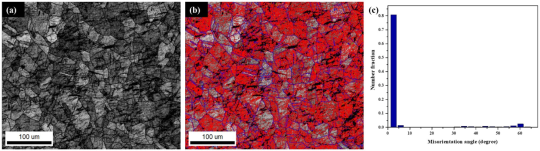 图7:(a) EBSD 晶粒映射 (b) 晶粒角度边界 (c) 晶粒角度边界分布。