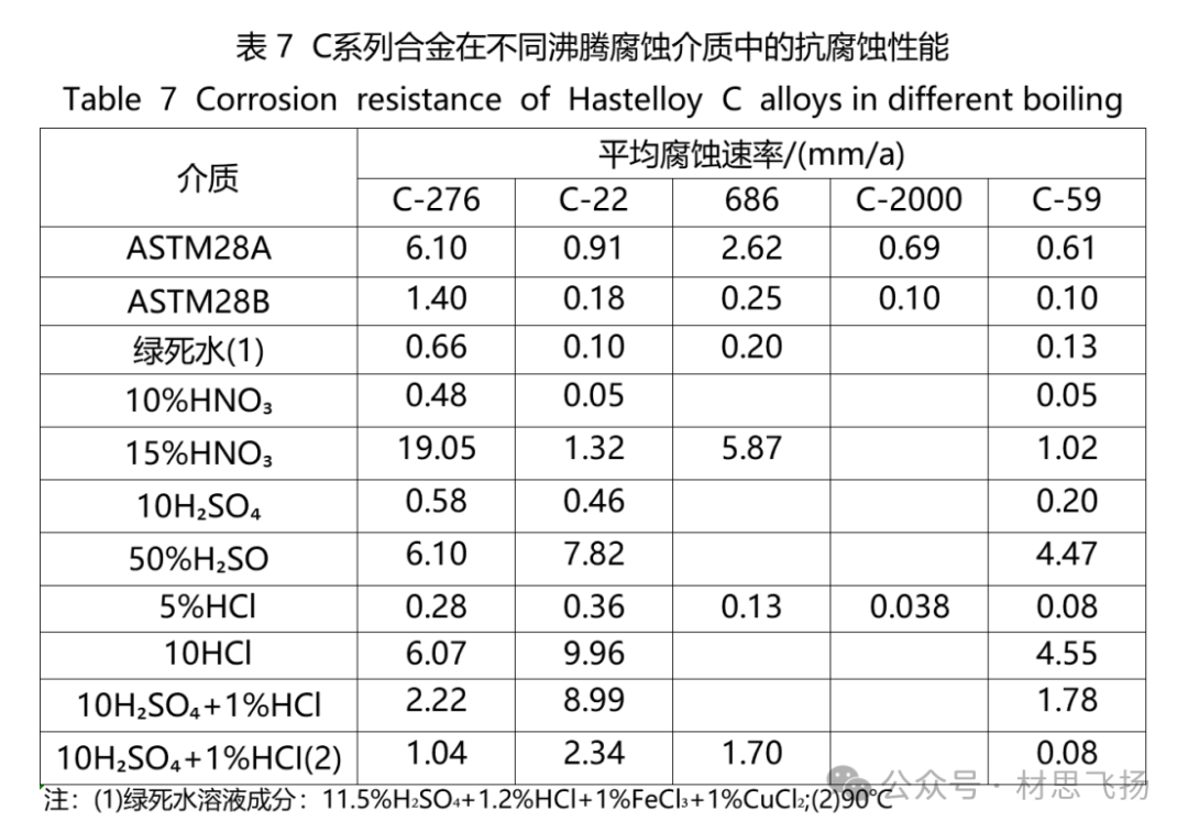 以铬(Cr)、钼(Mo)为主要合金元素的超低碳型镍 - 铬 - 钼(Ni - Cr - Mo)系合金,亦被称作哈氏(Hastelloy)合金。Hastelloy 为美国 Haynes International 公司之商标,其由 HAYNES 中的“HA”、STEI.LITE 中的“STELL”以及 ALLOYS 中的“OY”组合而成。哈氏合金作为一种高级镍基合金,针对多种恶劣腐蚀环境,诸如湿氧、亚硫酸、强氧化盐介质等,均展现出卓越的抗腐蚀性能。如表5 所示,哈氏合金主要涵盖 A、B、C、D、F、G、N、W、X 等系列。在国际上,生产哈氏合金系列产品的企业主要包括美国 Haynes International Inc(国际汉斯公司,为哈氏合金系列的研发企业)、Special Metal(超合金集团)以及德国蒂森克虏伯公司。B系列包括B、132及B3等型号,其在典型环境中的耐腐蚀性能列于表6。Hastelloy B合金在耐盐酸腐蚀方面表现最佳。通过将Hastelloy B合金的碳含量降至0.02%、硅含量降至0.1%,便制成了Hastelloy B-2合金。该合金可在沸腾温度下适用于各种浓度的盐酸环境,并提升了在敏化状态和焊接后的抗晶间腐蚀能力。20世纪90年代,Hastelloy B-3的开发解决了B-2在中间温度时易析出Ni-Mo沉淀相的问题,优化了加工特性。然而,Hastelloy B与Hastelloy B-2合金因铬含量极低,不适用于氧化性环境。哈氏合金C属于Ni - Cr - Mo系,是一种能够适应各类环境的通用型耐腐蚀材料。C系列合金的合金化程度相对较高,其中Cr元素和Mo元素分别在抵抗氧化性介质腐蚀和还原性介质腐蚀方面发挥作用,并且二者协同作用以抵御局部腐蚀(如点蚀和缝隙腐蚀)。C类合金在典型环境下的耐腐蚀性能如表7所示。哈氏合金G属于Ni - Cr - Cu - Mo系合金。相较于Ni - Cr - Mo合金,含铜的Ni - Cr - Mo - Cu合金在硫酸、磷酸等介质中展现出更为优异的耐腐蚀性能。含高铬量的Ni - Cr - Mo - Cu合金在硫酸、磷酸、含F⁻、Cl⁻的硫酸、磷酸以及湿法磷酸等介质中具备良好的耐蚀特性。向Ni - Cr - Mo - Cu合金中添加硅(Si)、硼(B),可使其耐受热浓硫酸腐蚀,同时具有较高的硬度与良好的耐磨性能。G系列合金包括G、G - 3、G - 30、G - 50等。G类合金在典型环境下的耐蚀性能如表8所示。哈氏合金G - 3、G - 30的研发成功,解决了合金在强氧化性或混合酸环境下的应用难题。新型哈氏合金G - 35本质上为Ni - Cr - Mo合金,其成分与C系合金相近。鉴于该合金的研发同样是针对强氧化性以及混合酸环境,故其商业牌号仍归属于G系列。