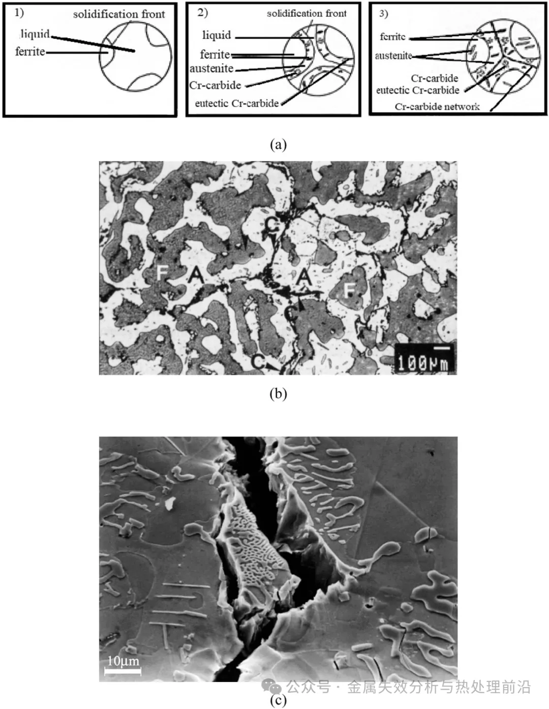 图7. 高碳双相不锈钢铸态组织。(a)W-Nr. 1.4463双相不锈钢的铁素体+奥氏体凝固模式顺序图;(b)W-Nr. 1.4464双相不锈钢经1050 °C 固溶退火30分钟后的微观组织,其中A为奥氏体,F为铁素体,C为M23C6碳化物[27];(c)W-Nr. 1.4464双相不锈钢铸态微观组织,显示一次碳化物处裂纹形核及裂纹沿一次碳化物网络优先扩展。扫描电子显微镜(SEM),二次电子像(SEI)