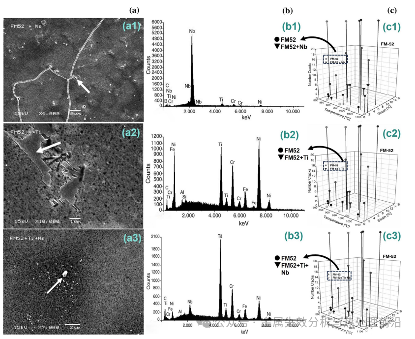 图31 添加Nb和Ti的镍基填充金属52热裂纹分析:a FM-52 断裂应变试验试样的显微组织:a1 FM-52 + Nb,a2 FM-52 + Ti,a3 FM-52 + Ti + Nb;b 所示晶界析出相的XEDS谱图:b1 富Nb晶界析出相,b2 富Ti晶界析出相,b3 富Ti-Nb晶界析出相,c 断裂应变试验结果对比:c1 FM-52与FM-52 + Nb,c2 FM-52与FM-52 + Ti,c3 FM-52与FM-52 + Ti + Nb