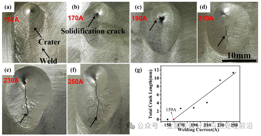 图17 不同电流下焊道形貌:a 150 A;b 170 A;c 190 A;d 210 A;e 230 A;f 250 A;g 最大裂纹长度随焊接电流(热输入)的变化关系