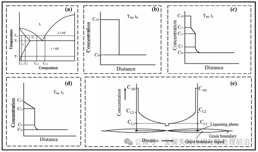 图23 成分熔化分析:a 二元合金相图,b γ-AB扩散偶初始构型,c 按照相图所示,熔化AB颗粒前方液相浓度梯度,d AB熔化末期液相中亚稳态浓度梯度的形成,e AB颗粒成分偏析熔化在晶界液膜中形成横向浓度梯度