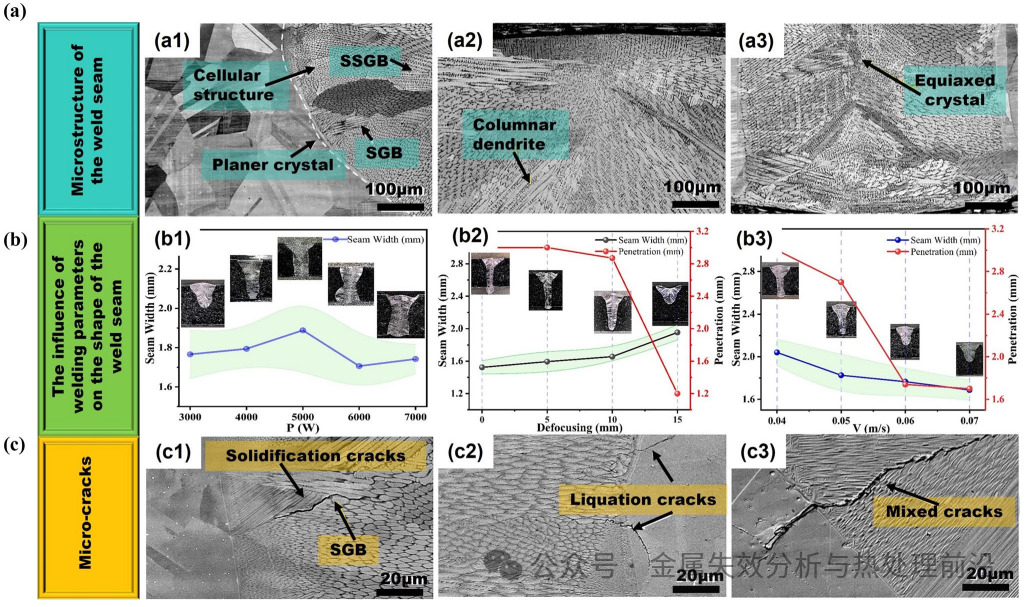 图6 激光焊接工艺参数对GH3539镍基高温合金焊接接头的影响:a 焊缝微观组织:a1 热影响区微观组织;a2 焊缝顶部微观组织;a3 焊缝底部微观组织;b 焊接参数对焊缝成形的影响:b1 在焊接速度为0.06 m/s条件下,不同激光功率下的焊缝宽度与熔深变化;b2 焊缝宽度与熔深随离焦距离的变化;b3 焊接速度与焊缝宽度/熔深的关系;c 焊接接头中的热裂纹:c1 凝固裂纹;c2 熔化裂纹;c3 混合裂纹[