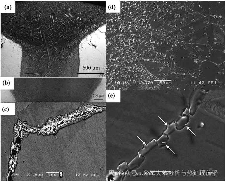 图26 不同热输入下718Plus镍基高温合金热影响区液化开裂分析:低热输入条件下718Plus高温合金激光焊缝熔合区与热影响区的光学显微照片,b高热输入焊接条件,c共晶回填,d高热输入激光焊无裂纹热影响区中的晶界液化,e热影响区晶界增厚现象。