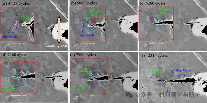 Ti-2Al-2.5Zr合金在σmax=420 MPa下的疲劳裂纹扩展行为,(a) 4423次循环,(b) 5069次循环,(c) 6260次循环,(d) 7260次循环,(e) 7990次循环和(f) 12,316次循环
