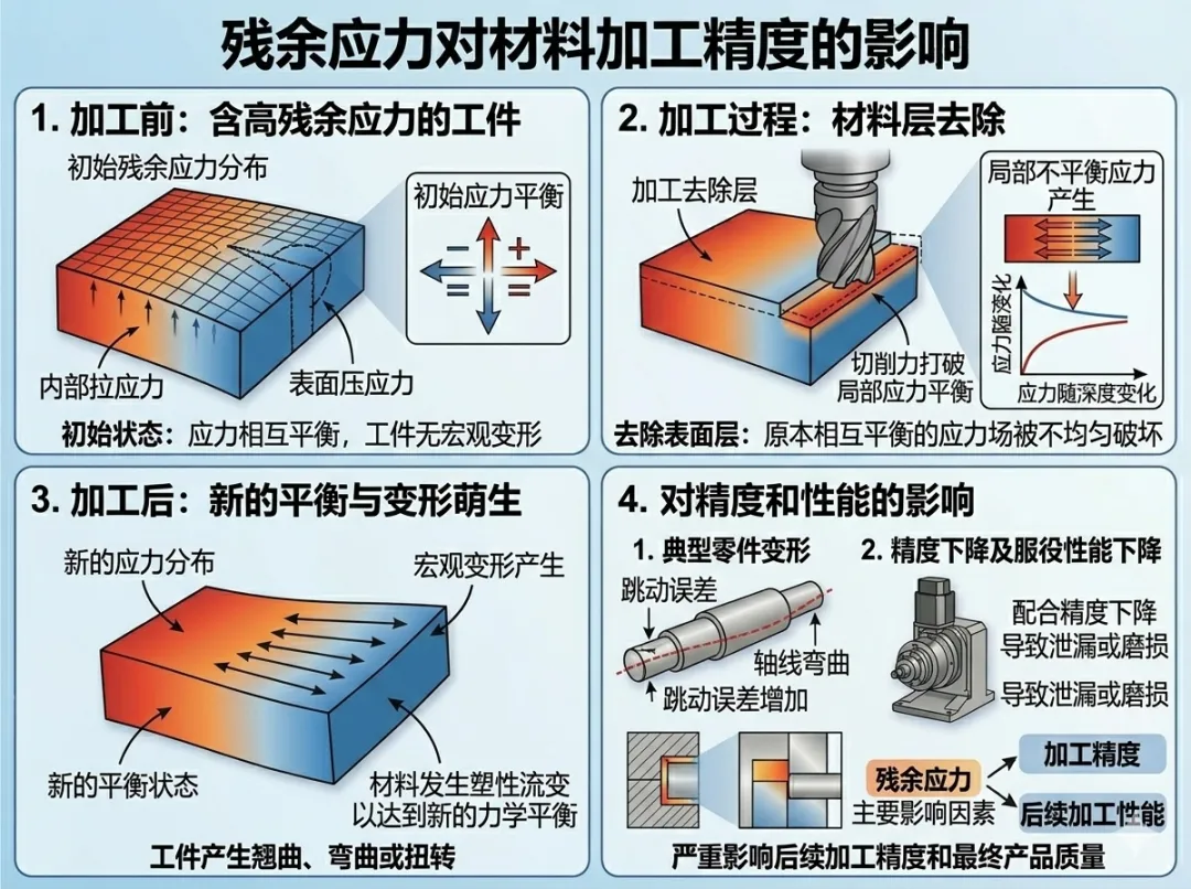 残余应力不仅影响构件的服役性能,还会影响后续加工过程的精度。当含有残余应力的材料被切削或去除一层材料后,原本的应力平衡被打破,材料会发生变形以达到新的平衡状态。这种变形会导致加工精度下降,严重影响产品质量。