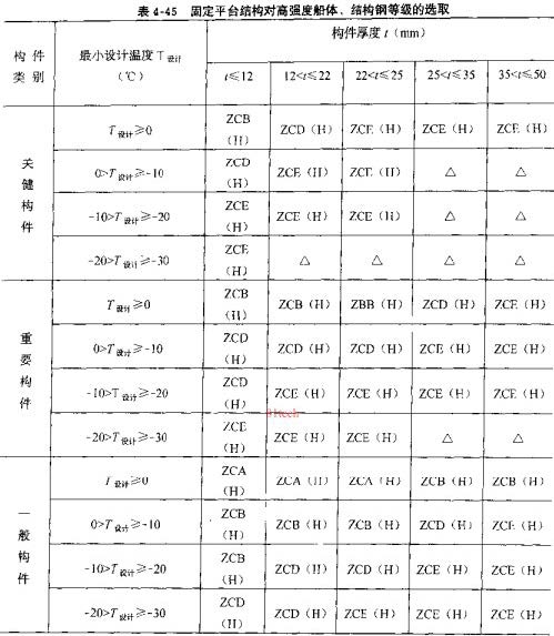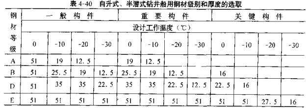 自升式、半潜式钻井船用结构钢根据构件类别、板厚和工作温度选用。
