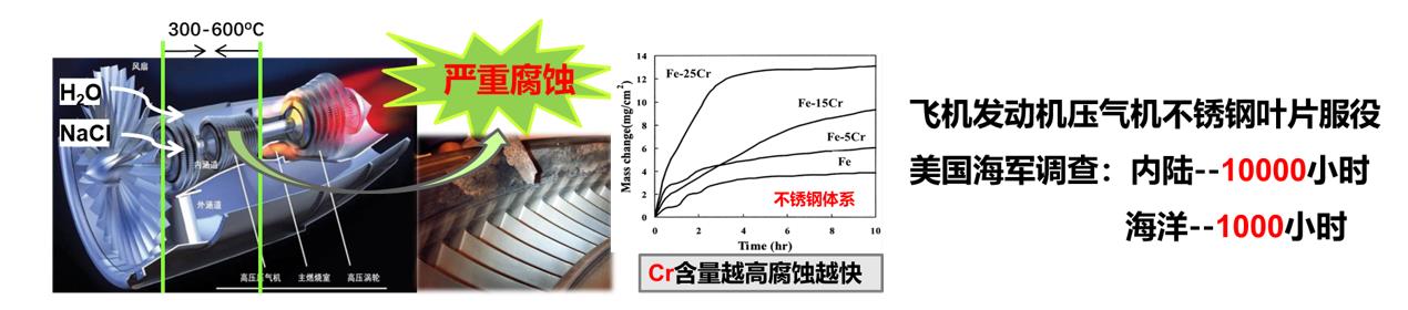 海洋装备动力系统服役环境苛刻复杂,主要包含高温(300-600oC)、高盐(NaCl)、高水蒸汽(H2O),其本质为中温固态NaCl-H2O-O2协同作用腐蚀。传统耐蚀合金不锈钢、钛合金等在该环境下加速腐蚀,导致相同型号动力系统装置在内陆地区服役可达上万小时,而在南海地区仅为500 - 1000小时。由于腐蚀机理不明确,无法从根本上理解腐蚀控制因素,导致动力系统选材及防护方法设计不清晰、无依据。