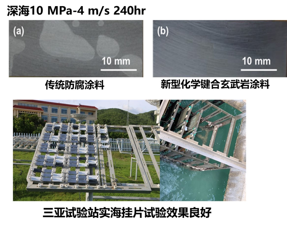 搭建多种涂层的成分-结构理论设计模型。突破高温机械力-化学键合界面调控技术,实现了涂层/金属、填料/树脂两大界面化学结合,研发出系列新型海洋苛刻环境用玄武岩化学键合防腐涂料。