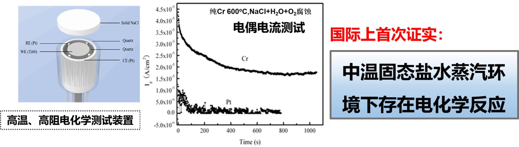 首次实现了中温固态盐下电化学表征,证明了“动态水膜”理论,揭示海洋高温金属化学-电化学交互作用机理;在钛合金上进一步建立“温度场-电化学场” Cl活性催化腐蚀机制。