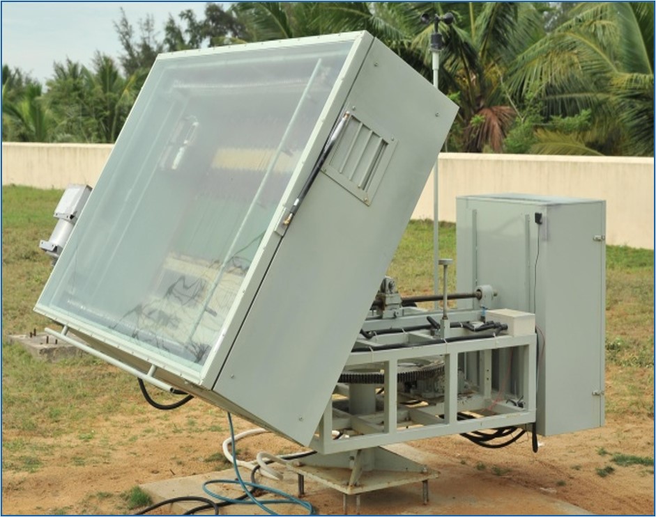 项目结合了自然环境试验的高模拟性与室内试验的高加速性,研发了一种基于自然大气环境试验的综合自然加速试验技术。目前国际已有的自然加速试验技术,普遍通过强化单一因素来提高加速性,而本装置通过追踪太阳增强日光辐照作用,高精度热交换技术控制温度的影响,集成喷淋及盐雾耦合增强湿气及氯离子的作用。该装置可以用于海洋及工业大气环境下的材料环境适应性评估。