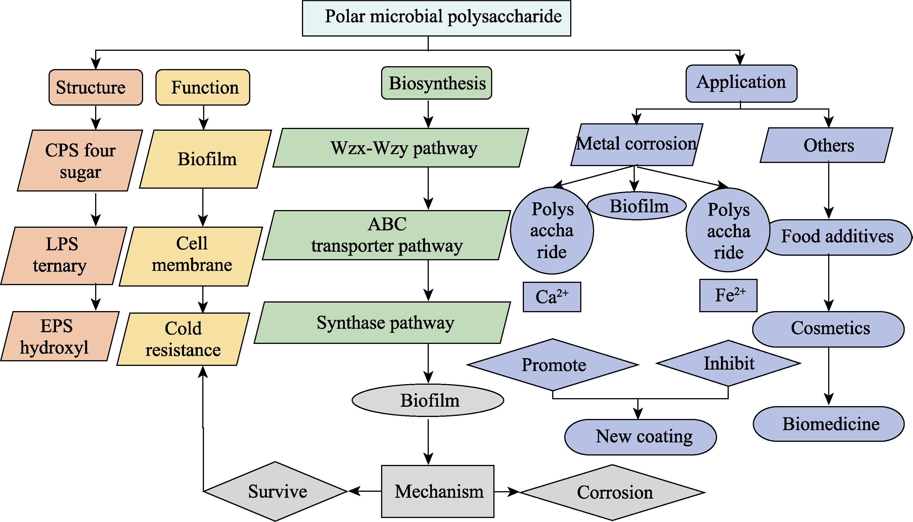 美丽的极地让人遐想无限,壮丽的冰川、浪漫的极光、奇妙的极昼与极夜、可爱的企鹅无一不令人憧憬和向往,这些也吸引着我国一代又一代科学家探索极地的美妙,勾勒出多彩的极地。自从1984 年五星红旗在乔治王岛首次飘扬至今,我国在两极已建成长城站、中山站、昆仑站、泰山站、黄河站等试验站,有力支持了我国极地科考研究。 极地气候系统在全球资源和战略中具有重要意义,随着人类对极地资源的开发以及各国极地权益的维护,极地研究也日益成为地区与环境科学领域的核心和热点话题。根据常识认为,冰天雪地环境下,气温如此之低,发生腐蚀的可能微乎其微。然而,根据实际观察,极地环境下并非没有腐蚀发生,而是在这种特殊环境下发生了一定程度的腐蚀,本期“2023年世界腐蚀日”就带您探索极地环境下的腐蚀问题。 01 极地环境下材料腐蚀 / 老化研究意义 02 极地环境下材料的腐蚀/老化 图2 部分站点 1.金属材料腐蚀 澳大利亚的 Maxwell 等通过研究南极 Ross 岛上材料的腐蚀认为,南极区域影响腐蚀的主要因素包括以下四点(图 3): (1) 较高的风速,且风中有时会含有颗粒损伤材料表面; (2) 较高的太阳辐照,导致有机材料的老化; (3) 材料表面覆盖的雪以及冰中的可溶性盐; (4) 夏季温度高于冰雪的融点导致材料表面被可溶性盐膜覆盖。 以上四方面会严重影响材料的腐蚀行为,并且Morcillo等发现,即使在冰层下,电化学腐蚀依然可以发生,这也导致金属材料在极地环境下腐蚀并没有想象中的轻微。以北极圈附近的阿蒂加斯为例,该地平均温度虽然低于0℃,但相对湿度和Cl-沉积速度均不低于我国的西沙海洋大气环境,对比不同材料的腐蚀速率结果发现,碳钢、锌、铜和铝均有较高的腐蚀速率,铝的腐蚀速率甚至高于我国西沙海洋大气环境。 图3 极地大气环境下材料腐蚀影响因素示意图 Marco等研究了SAE1070 碳钢在极地气候的乔治王岛以及亚热带海洋气候的复活节岛的腐蚀行为发现,极地气候的相对湿度较高,且当地 SO 2 浓度较高,可能与火山喷发有关。极地气候下碳钢的腐蚀速率略低,腐蚀产物主要为 α-FeOOH,亚热带气候下碳钢的腐蚀速率略高,腐蚀产物主要为 γ-FeOOH。 Hughes及Mikhailov 等对北极及南极区域碳钢的腐蚀行为进行了研究发现,在南极区域(纬度为负值),碳钢均经受了不同程度的腐蚀,在海拔较高且靠近南极的区域腐蚀较为轻微,其中在南极点,碳钢的腐蚀最轻;在海拔较低的区域,腐蚀相对较为严重且波动较大;在北极纬度略低的区域,腐蚀较为严重,甚至高于其他海洋大气环境。 2.有机涂层老化 除金属材料外,涂层在极地区域也会经受严重的损坏直至失去对金属的保护作用。在低温与强辐射综合作用下,涂层极易与基体发生剥离,并在强风下发生脱落。我国南极长城站即面临涂层老化严重的问题。目前,关于涂层在极地环境下服役的研究相对较少,Hattori等在 1991 年研究了 12种涂层材料在阿拉斯加地区 -25℃~+16℃下的失效行为,研究发现,氯乙烯和氯化橡胶在低温下的保护性较差,富锌涂料、喷涂锌与环氧树脂 / 聚氨酯混合使用具有较好的效果。Bjoergum等研究了5种涂层在-10℃~-60℃下对金属的保护性发现,低温条件下,腐蚀与机械载荷共存时,聚硅氧烷面漆保护性较差,增强聚酯涂料和硫化橡胶性能较好。Momber等在实验室研究过程中提出,使用 ISO20340 进行涂层耐久性试验中选用的最低温度(-20℃)偏高,并选用-60℃开展了加速老化试验,用来模拟极地环境下涂层的失效行为。研究结果表明,聚氨酯涂层低温下对金属的保护性效果较好,并以此指导极地开发中的海洋平台的涂装选择。 3.微生物腐蚀 南北极寒冷、干燥及强紫外辐射的极端环境孕育出数量丰富、种属各异的极地微生物,它们参与了极地大气和海洋间的碳循环,在基础研究方面具有重大的意义,是各领域科学家们研究新型微生物资源、低温修复、极地环境工程等科学技术问题的首要关注目标。由于极地海洋具有常年酷寒冰冻、光照辐射大、海冰层海水盐度高等极端环境特点,导致极地微生物也多具备独特分子生物学机制和生理生化特征。 温度是影响多糖分泌和活性的重要因素,上海海事大学研究发现叶氏假交替单胞菌在4 ℃与20 ℃下的总糖含量分别5.67 mg/g 与3.27 mg/g,证明低温环境确实促进极地微生物的分泌多糖。而多糖总量的提高可以有效抑制金属材料的腐蚀。埃及学者Hassan等研究发现多糖对于金属材料表面腐蚀的作用受温度影响比较明显,果胶酸盐作为一种水溶性天然多糖对于金属铝的腐蚀具有抑制作用,而其抑制效率随着温度的升高而降低,说明在低温条件下多糖能够更大程度地抑制金属表面腐蚀。极地微生物为保证生存,低温下分泌多糖含量增加,大大提高了生物膜的形成速度,而极地微生物的多糖含量一般较高,例如,来自南极的Sporobolomyces Salmonicolor AL 的胞外多糖最大产量为5.64 g/L,L. scotii 和C. laurentii AL 分别具有7.5 g/L 和6.0 g/L 的多糖生物量,以及文中提到极地微生物多糖的结构也发生一定改变,推测极地微生物分泌多糖对于金属材料的腐蚀会有比较明显的作用。目前极地微生物多糖的腐蚀研究相对空白,但是极地微生物多糖对金属材料腐蚀意义重大。该领域的研究可以丰富现有的微生物腐蚀机制、开发绿色缓蚀剂、提高极地微生物资源的利用率等(图4)。微生物多糖、生物膜、金属材料