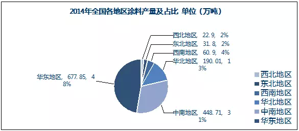 由上图,我们可以看出,华东地区2014年涂料生产总量为677.85万吨,占全国涂料生产总量的48%;华北地区2014年涂料生产总量为190.01万吨,占全国涂料生产总量的13%;西南地区2014年涂料生产总量为60.9万吨,占全国涂料生产总量的4%;中南地区2014年涂料生产总量为448.71万吨,占全国涂料生产总量的31%;西北地区2014年涂料生产总量为22.9万吨,占全国涂料生产总量的2%;东北地区2014年涂料生产总量为31.8万吨,占东北地区涂料生产总量的2%。