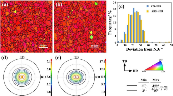 图11 (a) CS-HPR和(b) SRS-HPR样品的EBSD图谱和(c)相应的晶粒c轴与ND的偏差。(d) CS-HPR和(e) SRS-HPR样品的宏观织构。