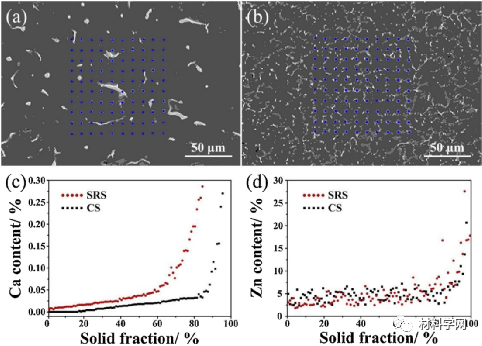 图5 (a) CS和(b) SRS铸态样品的EPMA分析及相应的(c) Ca和(d) Zn元素的溶质谱。