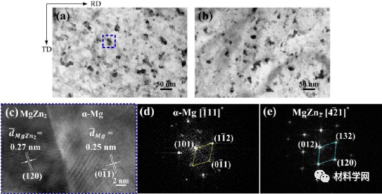 图10 (a) SRS-HPR和(b) CS-HPR样品的亮场TEM图像;(c)α-Mg基体与纳米析出相界面的HRTEM图像(用虚线标记);(d)α-Mg和(e) MgZn2相的FFT图像。