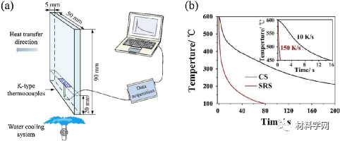 图1 (a)亚快速凝固(SRS)设置示意图;(b)CS和SRS样品的冷却曲线。